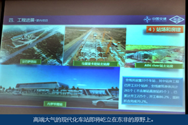 2017年,由中國交建總承包、中國路橋承建的肯尼亞蒙巴薩—內羅畢鐵路將通車。屆時,東風機車頭牽引的列車將從非洲巴黎……內羅畢啟程,奔向神奇的東非原野,迎著赤道線上的雪峰,跨過人類起源的東非大裂谷,與世界最大的自然野生動物保護區王國中的獅群和大象們親密接觸……