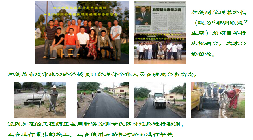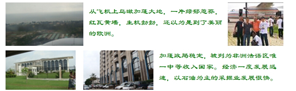 從飛機上鳥瞰加蓬大地,一片綠郁蔥莽,紅瓦黃墻,生機勃勃,還以為是到了美麗的歐洲。加蓬政局穩定,被列為非洲法語區唯一中等收入國家。經濟一度發展迅速,以石油為主的采掘業發展很快。加蓬年平均氣溫26℃,擁有豐富的森林資源,森林面積占全國土地面積的85%,被譽為非洲的“綠金之國”。加蓬的氣候很適宜植物的生長,美麗的出產的蔬菜瓜果品種繁多,真稱得上花朵,絢麗而多姿。加蓬副總理兼外長(現為“非洲聯盟”主席)為項目舉行慶祝酒會。大家合影留念。加蓬翁布埃市政公路經援項目經理部全體人員在駐地合影留念。派到加蓬的工程師正在用精密的測量儀器對道路進行勘測。正在進行緊張的施工,正在使用壓路機對路面進行平整站在自己修建的馬路上,別有一翻滋味在海邊一處施工工地現場。