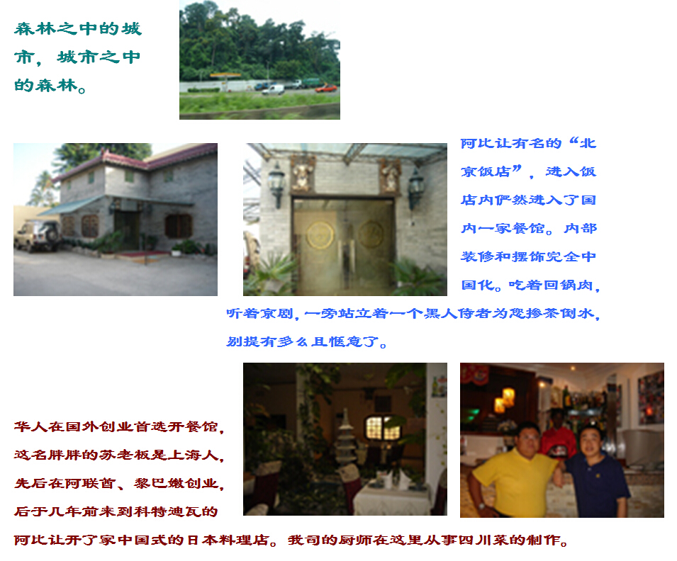 阿比讓有名的“北京飯店”,進(jìn)入飯店內(nèi)儼然進(jìn)入了國內(nèi)一家餐館。內(nèi)部裝修和擺飾完全中國化。吃著回鍋肉,聽著京劇,一旁站立著一個黑人侍者為您摻茶倒水,別提有多么且愜意了。華人在國外創(chuàng)業(yè)首選開餐館,這名胖胖的蘇老板是上海人,先后在阿聯(lián)酋、黎巴嫩創(chuàng)業(yè),后于幾年前來到科特迪瓦的阿比讓開了家中國式的日本料理店。我司的廚師在這里從事四川菜的制作。